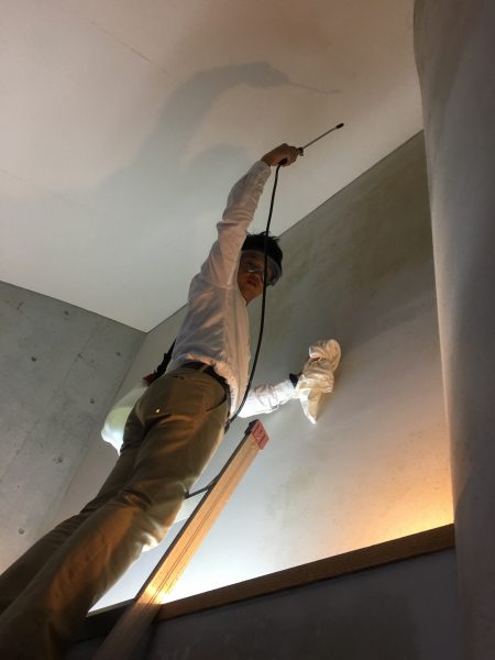 吹き抜け壁の高い場所に黒カビが発生していました。